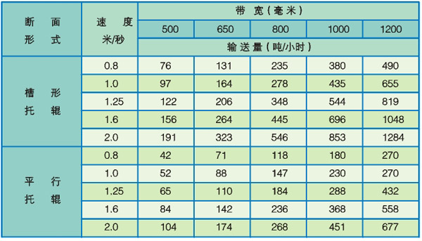 表中輸送量是物料堆積比重V=1t/m3.輸送傾角0—7。,物料在帶上是堆積角為30。的條件下計算的。